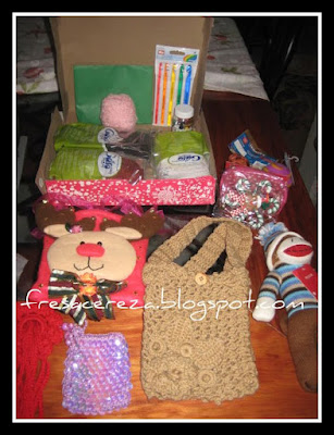 Aquí les muestro los detalles, primero los regalos correspondientes al miss manitas, madejas de estambre el gato, que es de mis favoritos, una madeja rosa muy suave, unos coloridos ganchos y un frasco lleno de ojitos, narices y demás complementos para mis amigurumis.
